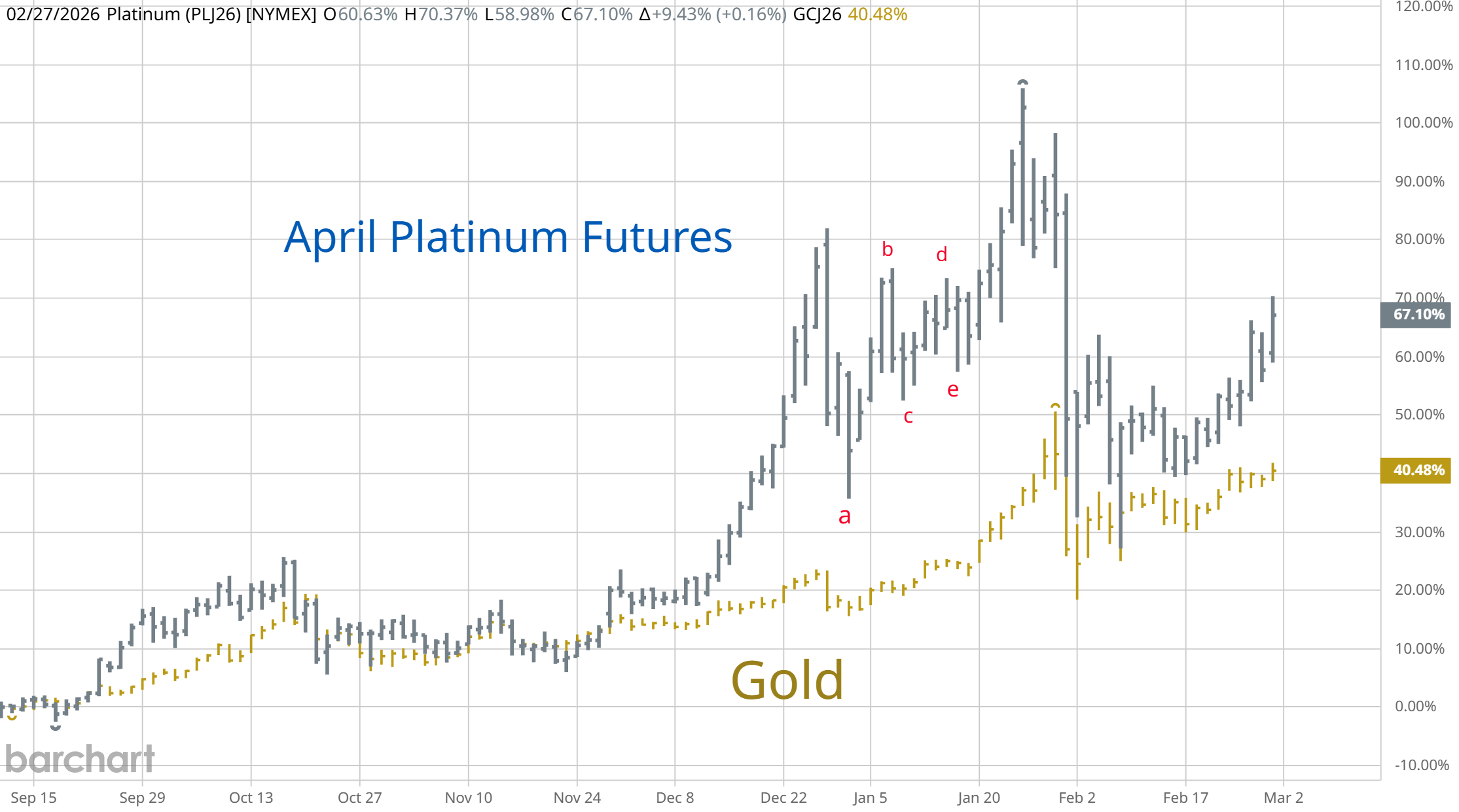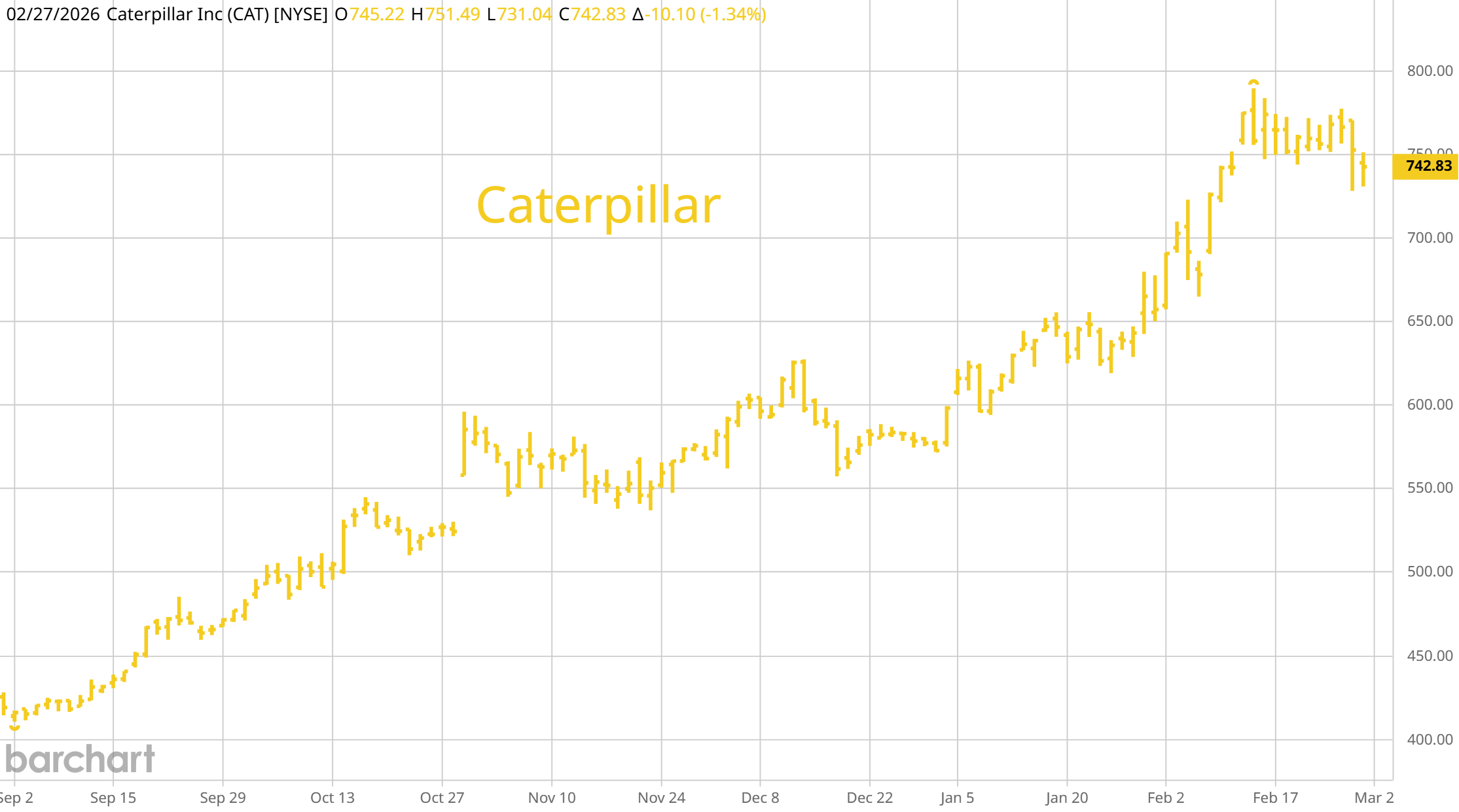 On the left are daily bars of the Dow Jones Industrial Average. The arrows point to possible 39 trading day cycle lows as theorized by Cyclesman. If January 2nd was the last low then this coming week is the timing band for the next one. If January 20th was the bottom of the last cycle then the week of March 9th would be the next target. On the right is Caterpillar, the big construction equipment maker. It is the 2nd most heavily weighted stock in the Dow and is responsible for much of the up move into mid-February. Last time I wrote that it is a key stock to watch for the "build back" theme. It hit its high right around the time I posted my last update.