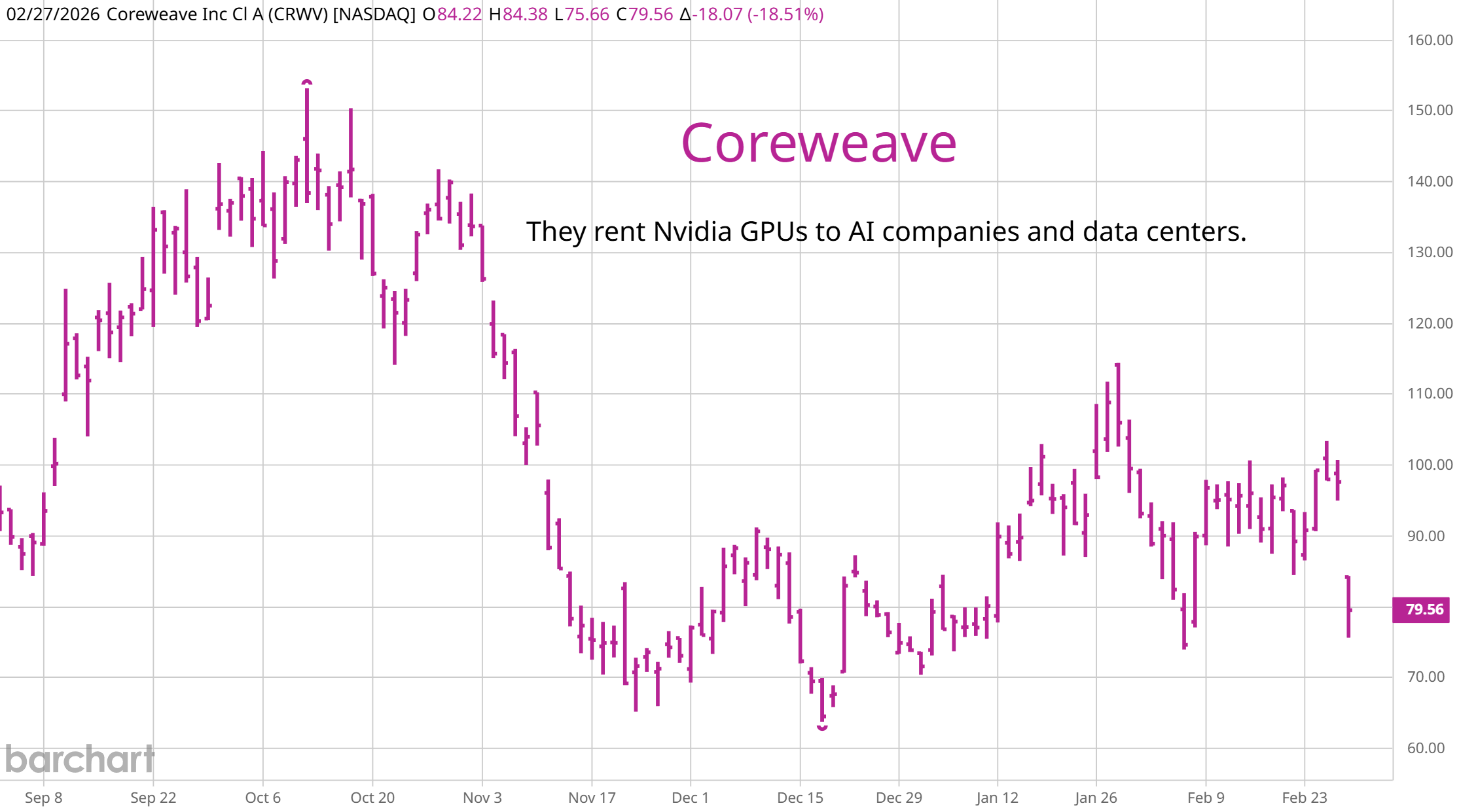 The push for AI and the worries about private credit are linked. To the left is an ETF that tracks North American Software companies. A few years ago, Private Credit was a popular fad after Private Equity pools ran out of decent private companies to buy and leverage up for immediate returns. Analysts say that software companies in particular were the beneficiaries of private credit loans. Now, there is a scramble to get money out of these funds. Many have covenants that allow the private credit funds to restrict redemptions. Blue Owl Capital manages a group of them and is restricting the return of capital to investors in some pools. Coreweave leases chips and servers to data center builders and to do this they borrow huge amounts of money to buy the necessare Nvidia chip bundles. Last fall, they were considered to be a cutting edge tech company in the hottest sector of the market. As with the rest of AI, investors are looking at the amount of money they are borrowing and backing away from them. Fitch credit rating service has a BB- credit rating on them. S&P Global is still at B+.