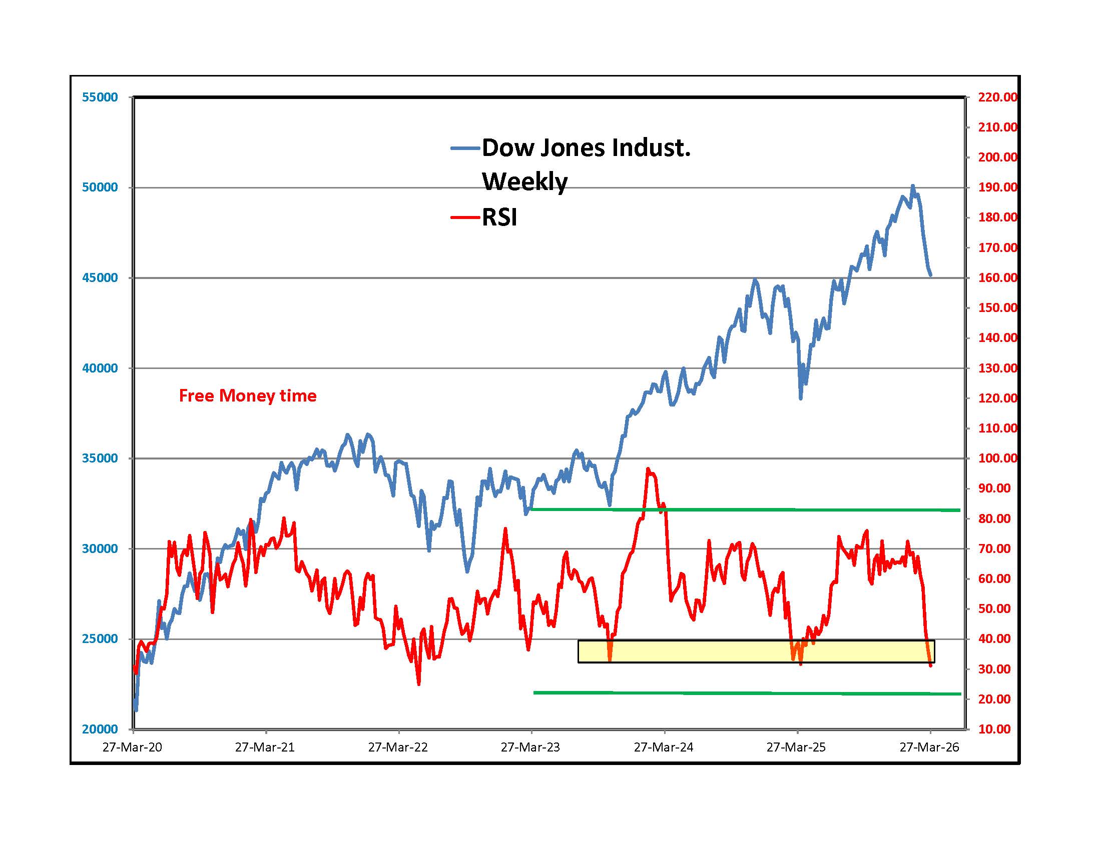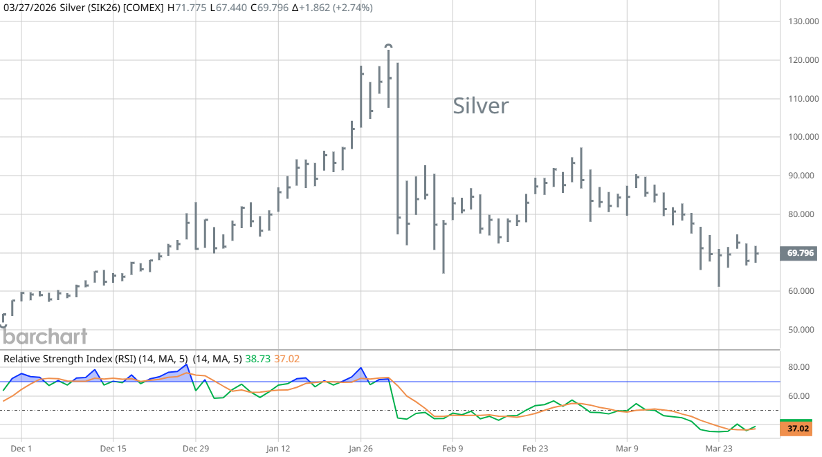 Silver lost nearly half its value in the first plunge. The upper right chart shows the daily closing price in NY and a simple RSI momentum oscillator. It is at levels where silver usually rallied in the past but with the war ongoing and cash needs increasing, who dares to buy?