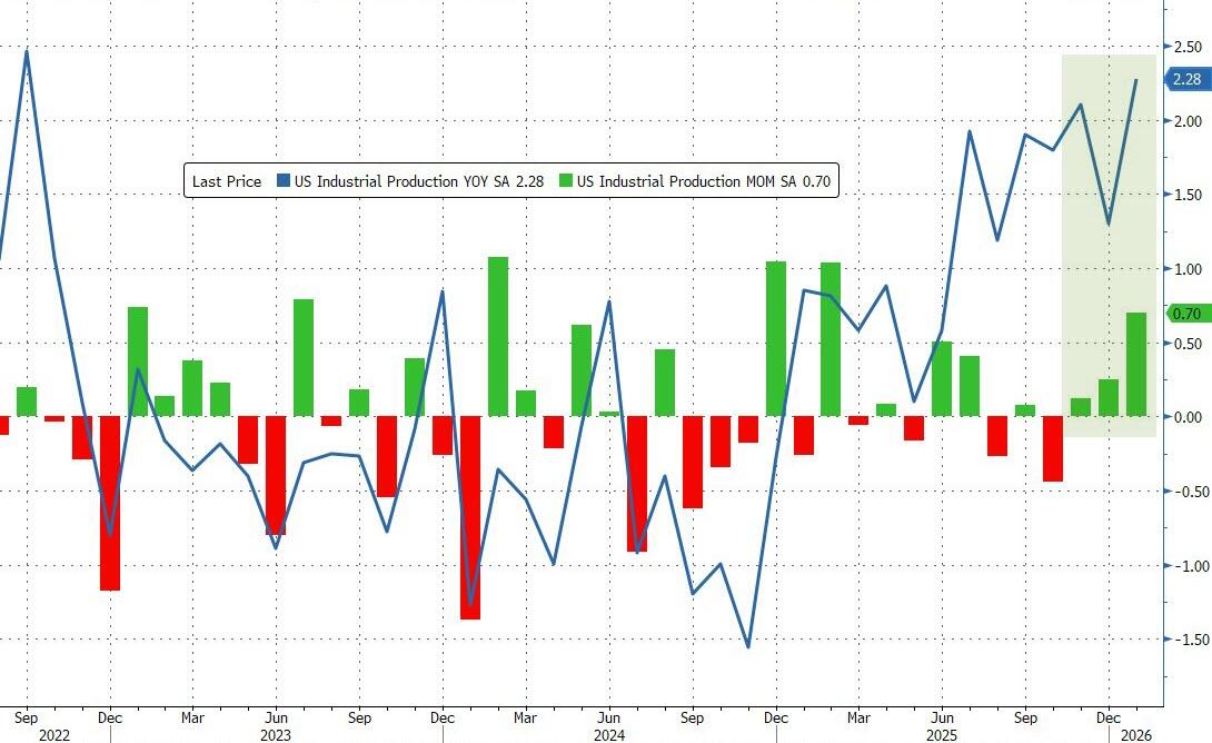 January Industrial Production (left) rose 0.70% month over month and 2.8% year over year. This is the best reading since the fall of 2022. Manufacturing Output (upper right) also showed a healthy gain