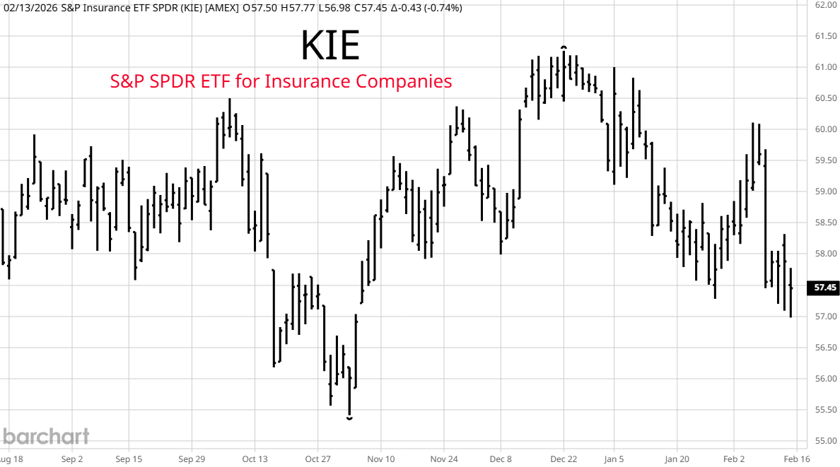 KIE is an insurance company ETF. If AI can analyze your needs and suggest products to protect you, why pay an insurance company or consultant? On top of that, we now have Prediction Markets that price the probability of events in real time. They are thought to be more accurate than polls or other methods in giving the latest real time odds of certain events taking place. Analysts say that taking positions in Prediction Markets can in many instances replace insurance and at a much cheaper price.