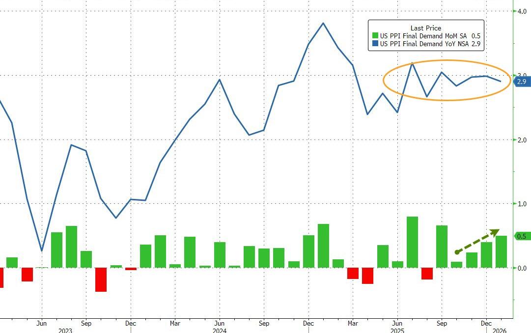 On Friday we got January Producer Prices, a reading of wholesale inflation. The upper left graph shows the headline number. The right side shows Core Producer Prices which subtract food and energy. Both sets of data came in much hotter than analysts expected. The headline number was lower than the core reading due to lower gasoline prices. Directly to the left is a graph of April Gasoline futures and you can see what happened since this survey was taken! The year over year reading on the core number is 3.6%. A Wall Street narrative is that inflation is under control and will gradually fall toward 2%. The PPI data goes against this.The big increase came from the costs for machinery and other industrial goods. All the government and data center spending is allowing vendors to jack up prices.