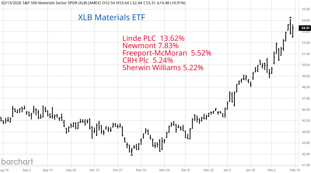 Two of the best performing ETFs are thought to be beneficiaries of the current tariff policy and government debt funded industrial policy. On the left is XLI the SPDR Industrial sector ETF. Once again, Caterpillar is at the top of the list and you can see the blow off type pattern it is making. The other companies are a mix of industrial and defense names. XLB focuses on Materials suppliers. Linde is huge in industrial gases, especially those used in welding. Newmont is the big gold mining firm and Freeport mines gold and copper. CHR is a building materials company with a big market share of the cement, asphalt and concrete business. Aside from the Supreme Court ruling against tariffs, the danger to these groups is that much of the energy behind our current industrial policy rests with an 80 year old President and a legislative branch that knows he has only 3 more years. Last week, the House of Representatives voted against the President's tariffs on Canada. It seemed like a small event but it could be the first crack between a very strong President and politicians who are now more worried about being reelected than they are the anger of a soon to be lame duck, President Trump. If the polls continue to turn against republicans, the tariffs and industrial policy behind the gains in these companies is in danger.
