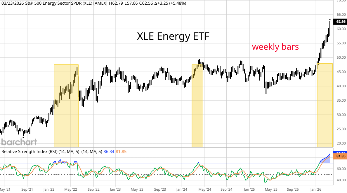 By week's end, the energy sector was the big winner. The left side graph shows XLE, the ETF that includes all the majors. Below is a simple RSI momentum oscillator with yellow rectangles marking previous periods when it was near the top of its range. The first, around the Russian invasion persisted for four months. While the party lasts, everyone is making money, but, a deal to open the Straits would cause a plunge in prices. On the right is a graph of the daily closing price of XLE and WTI Crude Oil. The yellow rectangle marks the value of XLE the last time the nearby futures contract closed a week at around $100. The difference was that traders were pricing in future lower energy complex profits. It marked a low for XLE. Now, they see unlimited profits.