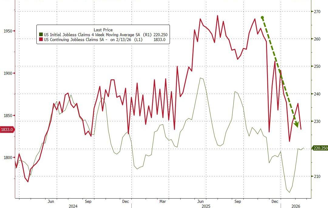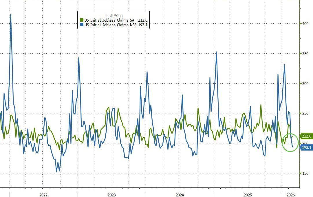 New Claims for Unemployment Benefits came in near the bottom of their recent range at 212,000 (left side green line). A couple of weeks ago there was a big spike up in the unadjusted number. This week it went in the other direction (blue line). Continuing claims (right side, red line) fell again and the four week average of new claims was flat. If AI is killing jobs, we are not seeing it in New Claims for Unemployment Benefits.