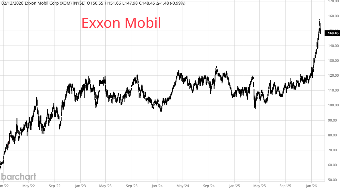 Above are graphs of crude oil and Exxon. Many of the other major oil companies are very popular too but Exxon is leading the way. Smart analysts continue to say that oil is the next gold or silver. Investors in the energy patch are not waiting for the spike higher. Exxon is a well run company generating a huge profit but like Caterpillar, does its future justify the extraordinary surge higher?