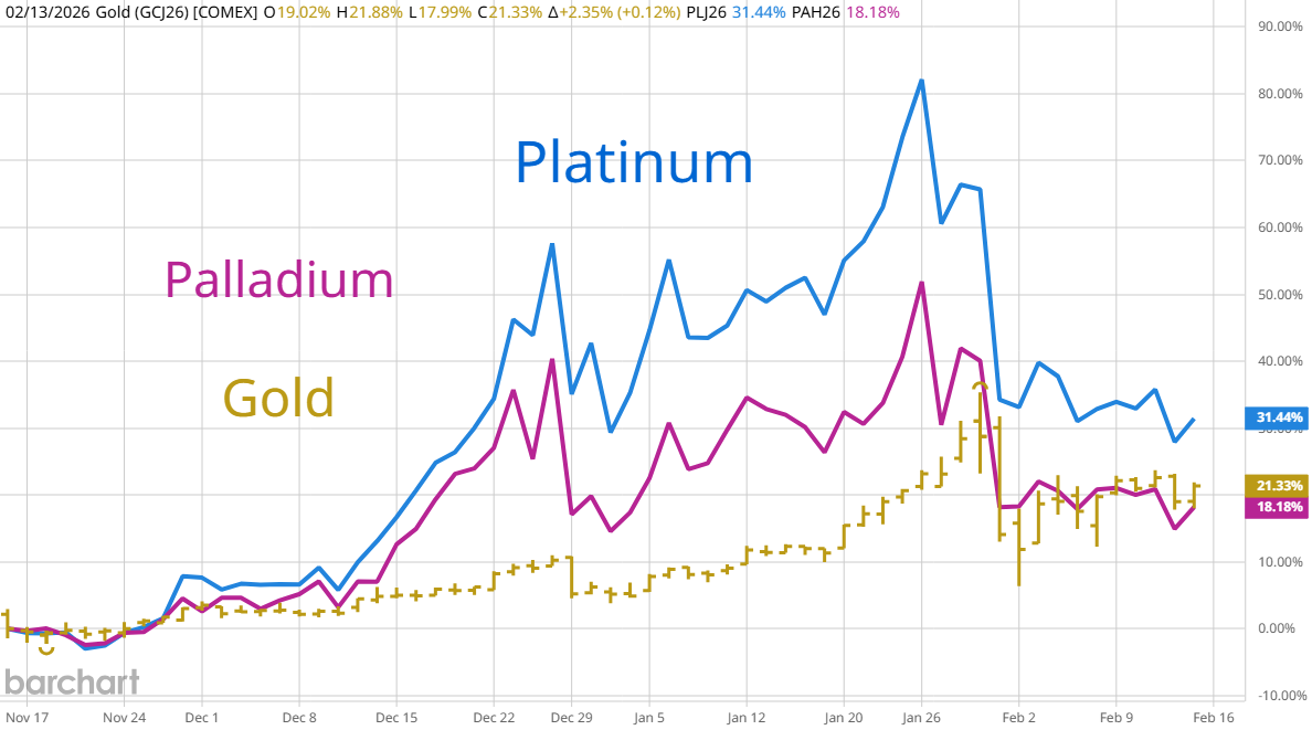 One can make the chart pattern case that silver is consolidating in a contracting formation that will lead to another thrust down. Last week I read a report about how backed up silver refining is with months of supply sitting on receiving docks waiting to be melted, purified and delivered into major exchanges in the coming months. Where did the shortage go? On the right is a graph comparing platinum, palladium and gold prices. They are moving in lock step. Are you aware of any new technology that is going to use massive amounts of platinum and palladium next year? The spike higher in metals allowed producers to lock in very profitable prices for future delivery of metals and that will be used to expand output.