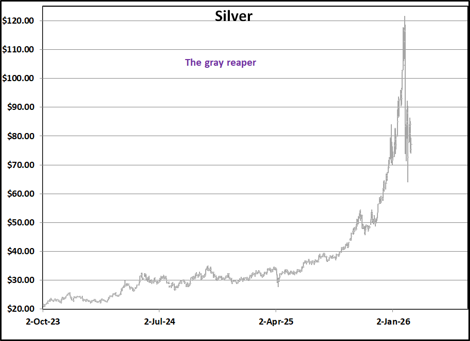 What are the hot stocks? Anything to do with building out physical plant and equipment. Caterpillar is the absolute winner because its equipment is used in construction and in mining. It is also the second most weighted stock in the Dow Jones Industrial Average, accounting for 9.63% of its move on a daily basis. Microsoft makes up 4.99% and you can see what it has done lately above. On Tuesday of last week, Caterpillar closed at $742.37. On Wednesday it finished the day at 775. Did anything in the real world change fast enough to justify a $32.63 price change in the stock (4.39%)? No. It reminds me of the big price moves we saw at the end of the silver rally. Just for fun I included a silver chart next to the Caterpillar graph.